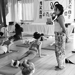 Deep relaxation and stress relief through guided meditation, asana open to all, and a savasana with sound healing while surrounded by candle lights.